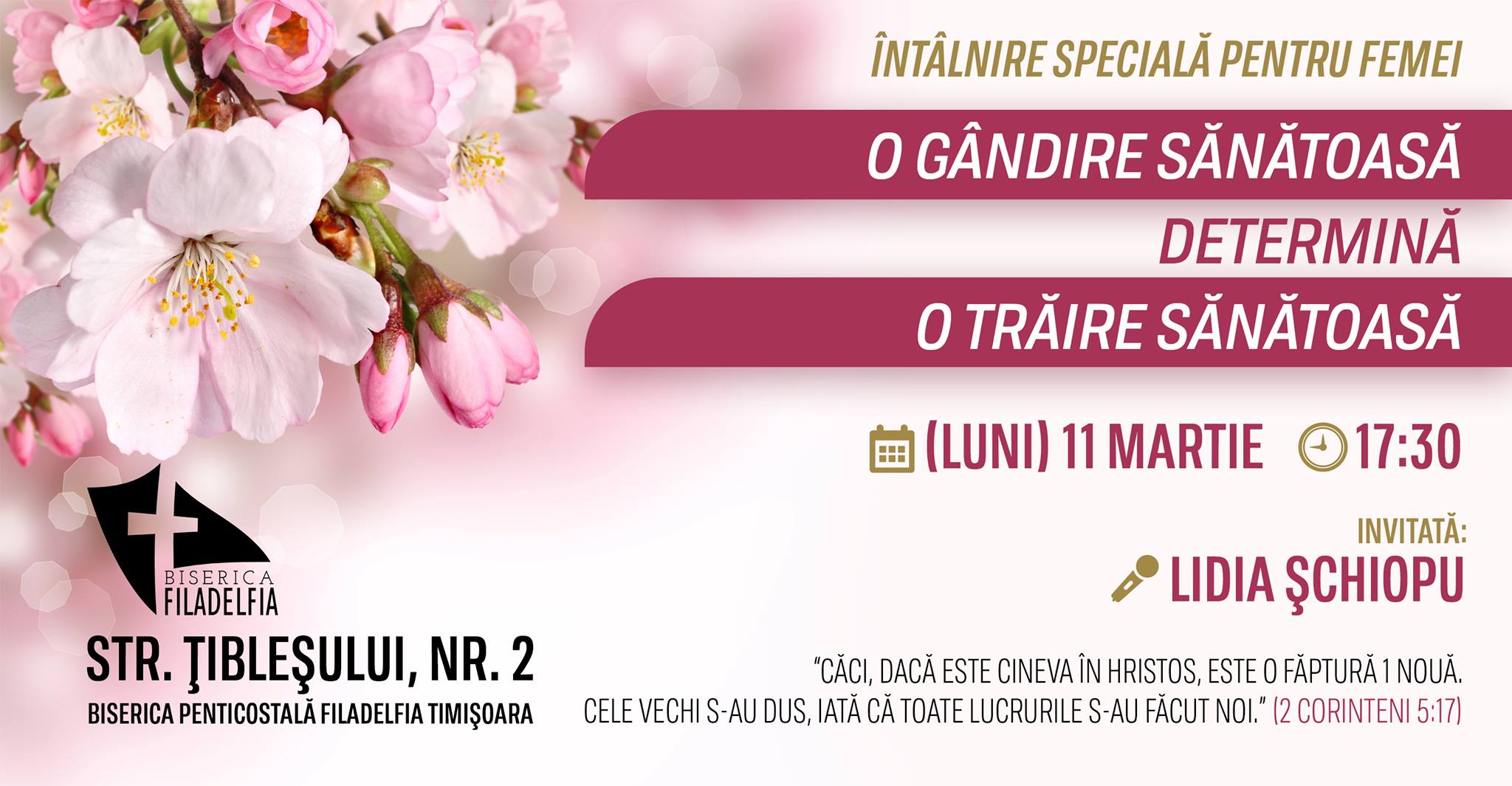 Luni, 11 martie, ora 17:30, Biserica Penticostală Filadelfia Timișoara, găzduiește o întâlnire specială pentru femei. Invitata specială a serii este Lidia Șchiopu. Tema întâlnirii este: „O gândire sănătoasă determină o trăire sănătoasă”.