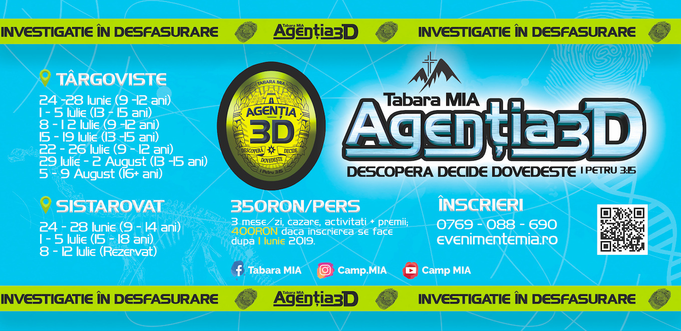 „AGENȚIA 3D – Descoperă, Decide, Dovedește“ este provocarea Taberelor MIA 2019. În această vară, oferă copiilor tăi o aventură pe măsură în taberele MIA la Târgoviște și Șiștarovăț. Implică-i într-o investigație în desfășurare care îi va ajuta să Descopere, să Decidă și să Dovedească adevăruri solide ale creștinismului.