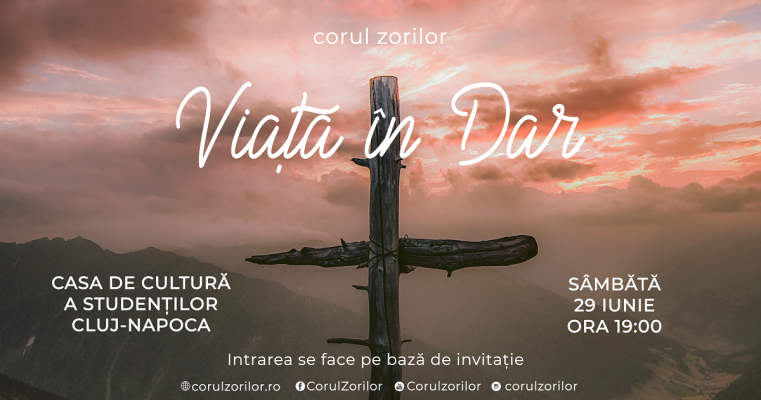 Este setul de melodii care vor să atingă fiecare inimă rănită, pierdută în furtunile vieții. Veniți să primiți „Viață în Dar” de la Cel ce este însuși viața! Nu pierdeți oportunitatea de a vă odihni trupul și sufletul într-o seară de închinare, alături de Corul Zorilor, sâmbătă, 29 iunie, la Sala de Cultură a Studenților. Pentru mai multe detalii accesați site-ul oficial, iar pentru update-uri în timp real vedeți evenimentul Facebook | Viață în Dar.