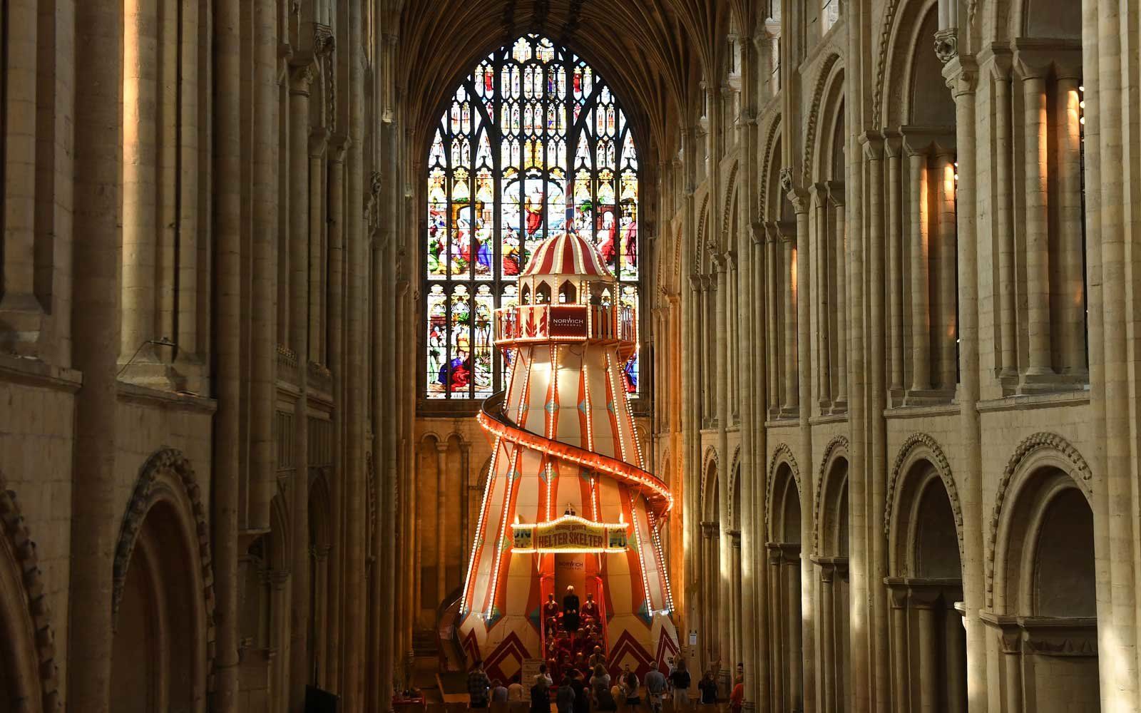 Liderii Catedralei Norwich din estul Angliei au aprobat construirea unui carusel de aproximativ 15 m în interiorul clădirii, la 8 august, numind-l „skelter helter” (talmeș-balmeș n.tr).