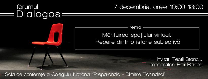 Sâmbătă, 7 decembrie, Grupul Dialogos vă invită la o nouă întâlnire cu tema: „Mântuirea spațiului virtual. Repere dintr-o istorie subiectivă”, cu Teofil Stanciu. Locația rămâne aceeași, Conferințe a Colegiului Național Pedagogic „PREPARANDIA-DIMITRIE ȚINCHINDEAL”, Bulevardul Dragalina, nr. 3-5, începând cu ora 10:00.