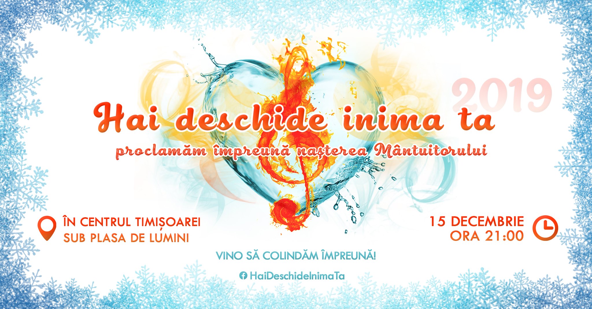 „Din nou dorim și noi să colindăm și să proclamăm împreună nașterea Mântuitorului. Care „noi”? Eu și tu, cel care vezi invitația aceasta, ai inima bună și dorești să colinzi. Vino să vestim împreună Motivul acestor sărbători, Nașterea lui Isus. Toată lauda vrem să o aducem Lui. Împreună cu tine vom cânta colinde creștine cunoscute care ne vor încălzi sufletele noastre. Invită-i și pe prietenii tăi, și veniți împreună! Nu uita! 15 DECEMBRIE, ORA 21:00, ÎN CENTRU, în fața Operei Naționale, SUB PLASA DE LUMINI! Nu uita să iei cu tine buna dispoziție. Inima bună sigur nu o vei uita. Îți vor fi de mare folos! Te așteptăm!”.