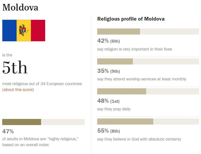 Aceasta este urmată de Armenia, Georgia și Republica Moldova. La criteriul de Frecvență a rugăciunii, Republica Moldova se clasează pe primul loc. 48% dintre moldoveni au afirmat că se roagă zilnic.