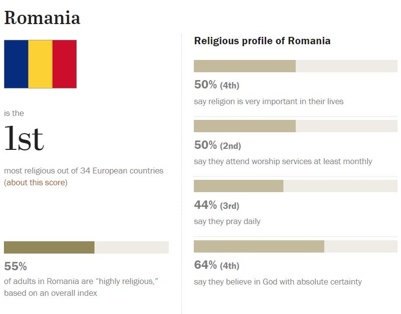 Un studiu al Centrului de Cercetare PEW desfășurat recent în 34 de state din Europa, plasează România și Republica Moldova pe locurile de frunte la credința în Dumnezeu și la practicarea rugăciunii. România ocupă primul loc în top, fiind cea mai religioasă țară Europeană, la majoritatea criteriilor după care s-a desfășurat cercetarea.