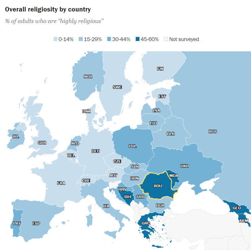 Europenii, în general, sunt mai puțin religioși decât oamenii din alte părți ale lumii. Dar, în Europa, există, uneori, diferențe considerabile în ceea ce privește nivelul angajamentului religios.