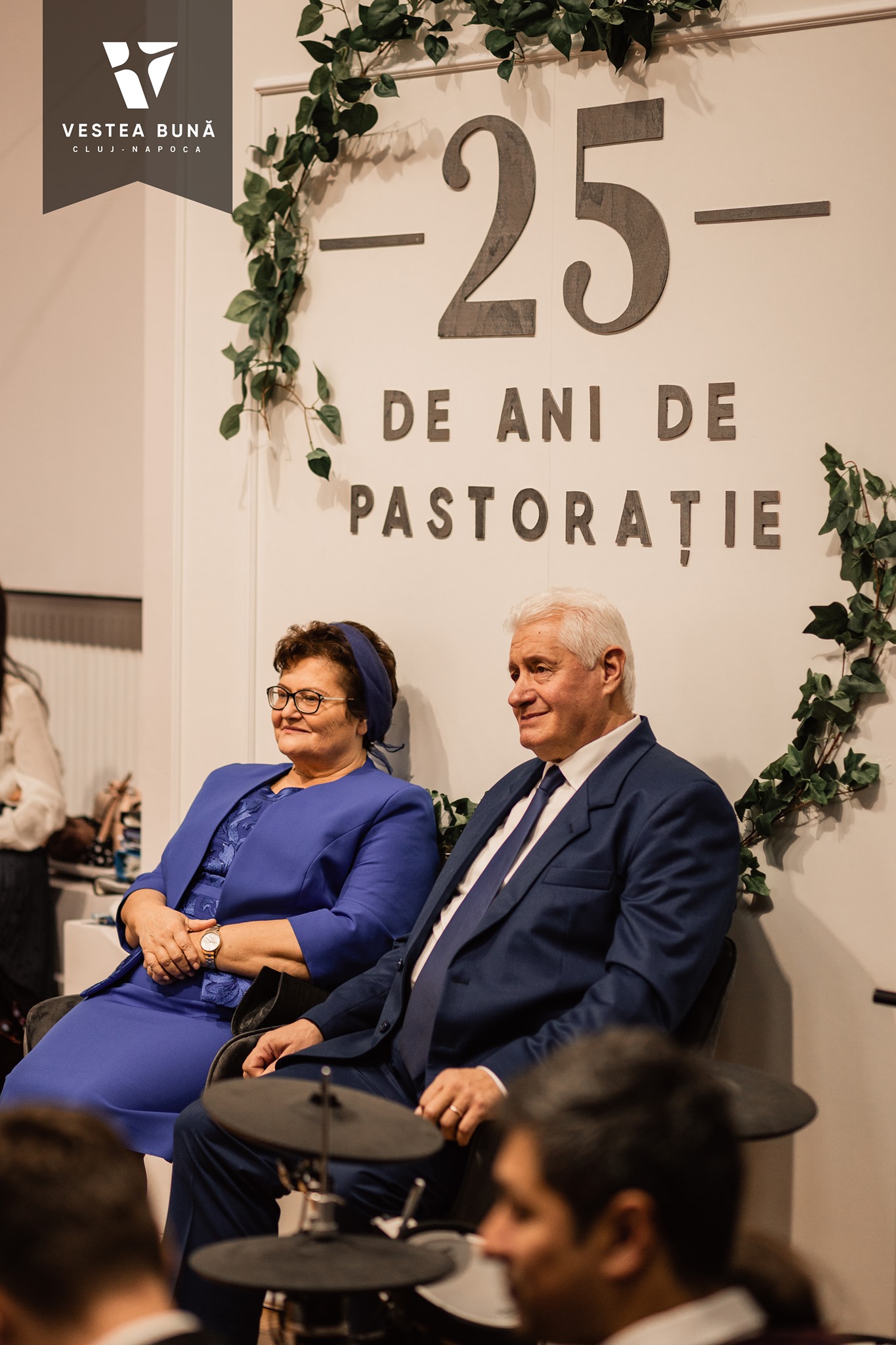 „În recunoașterea celor 25 ani de slujire pastorală, vă mulțumim și vă apreciem pentru înțelepciunea și răbdarea dumneavoastră, pentru devotament și dăruire, pentru credincioșie, verticalitate și maturitate în gestionarea situațiilor dificile, pentru entuziasmul și optimismul pe care reușeați mereu să le regăsiți și să le insuflați celorlalți, precum și pentru bunătatea și voioșia mereu prezente pe chipul și în sulfetul dumneavoastră. Fiți binecuvântat!” a fost mesajul pastorului Daniel Bujeniță, în numele întregii comunități pentru pastorul Ambrosie Pop și a soției dânsului care l-a susținut cu dedicare în acest drum.