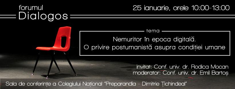 Sâmbătă, 25 ianuarie 2020, echipa Forumului Dialogos vă invită la prima ediție din acest an cu tema: „Nemuritor în epoca digitală – o privire postumanistă asupra condiției umane”. Tradițional, evenimentul este găzduit de Sala de Conferințe a Colegiului Național Pedagogic „Preparandia – Dimitrie Țichindeal”, Bulevardul Dragalina, nr. 3- 5.