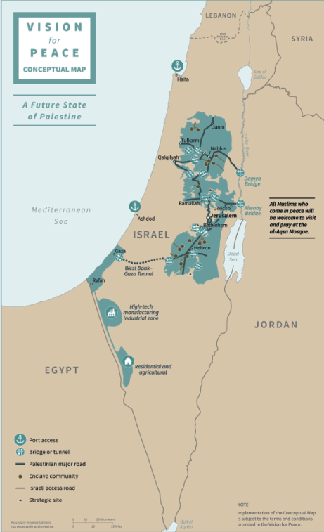 Administrația Trump și-a prezentat marți seară planul de pace pentru Israel și palestinieni, cerând întărirea teritoriilor și suveranității Statului Israel și susținerea pentru înființarea unui stat palestinian.