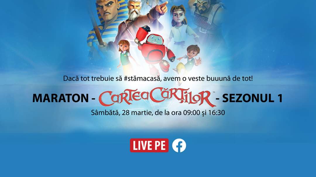 Următoarele trei zile de sâmbătă, rezervați intervalul dintre orele 09:00-12:30 și de la 16:30-19:30, pregătiți floricelele și faceți-vă comod în fața ecranelor! De la mic și până la mare explorați aventurile lui Cristi, Oana și Memo prin istoriile Cartea Cărților.