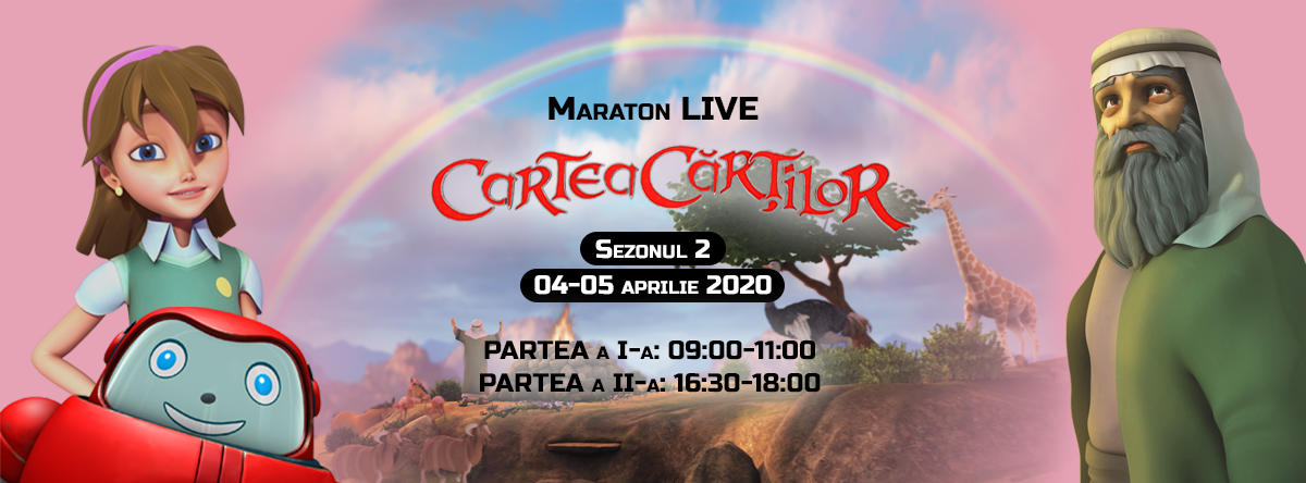 Un nou weekend marca Cartea Cărților LIVE! Părinți, copii și bunici, vă invităm la o nouă serie de aventuri prin Cartea Cărților alături de Cristi, Oana și Memo. Sâmbătă și duminică, 4-5 aprilie, urmăriți integral Sezonul 2, călătorind în vremurile biblice din următoarele perioade: