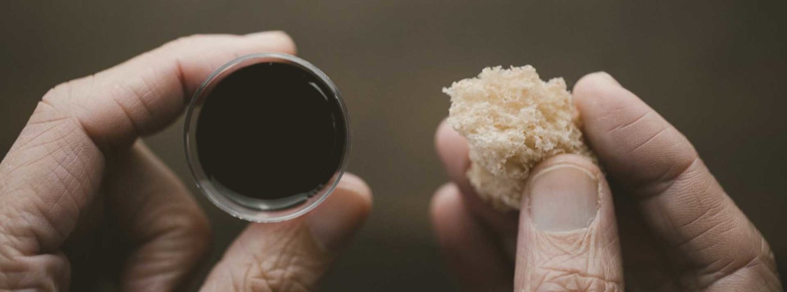 „Pe când mâncau ei, Isus a luat o pâine; și după ce a binecuvântat a frânt-o și a dat ucenicilor Săi zicând „Luați, mâncați; acesta este trupul Meu.” Apoi a luat un pahar și după ce a mulțumit lui Dumnezeu, li l-a dat zicând: „Beți toți din el, căci acesta este sângele Meu, sângele legământului celui nou, care se varsă pentru mulți spre iertarea păcatelor” (Matei 26:26–28).