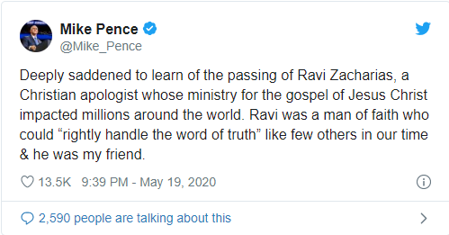 Vicepreşedintele american Mike Pence a postat pe reţeaua Twitter că a fost „cuprins de o adâncă tristeţe la aflarea veştii plecării în veșnicie a lui Ravi Zacharias, un mare apologet creştin a cărui lucrare în câmpul Evangheliei a atins milioane de oameni din toată lumea. Ravi a fost un om al credinţei care ştia cum să împartă drept cuvântul adevărului aşa cum puţin oameni au făcut-o şi a fost un bun prieten.” Pence a continuat spunând: „Atunci când a aflat de moartea lui Abner, David a spus: ‘Nu ştiţi că un mare prinţ a căzut astăzi în Israel?’ Ravi a fost un astfel de om şi îi vom simţi foarte mult lipsă. Karen şi cu mine transmitem condoleanţe familiei şi suntem mângâiaţi de gândul că el a auzit „Bine, rob bun şi credincios.”