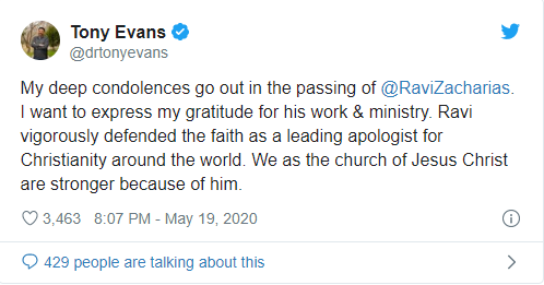 Şi pastorul Tony Evans şi-a exprimat recunoştinţa. „O mare tristeţe mă cuprinde la gândul că l-am pierdut pe Ravi Zacharias. Îmi exprim recunoştinţa pentru lucrarea şi slujirea lui. Ravi a apărat credinţa cu vigurozitate, fiind liderul apologeților creştinismului din toată lumea. Noi ca și biserică a Domnului Isus Hristos suntem mai puternici datorită lui.”