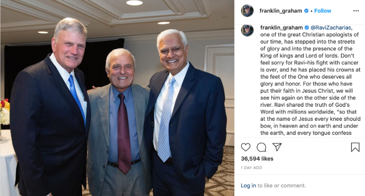 Franklin Graham, evanghelist şi preşedinte al organizaţiei Samaritan’s Purse, s-a alăturat şi el vocilor care deplâng pierderea lui Zacharias. El a postat o fotografie în care apare alături de Ravi şi de Sami Dagher, care era de asemenea un apologet. Graham a spus: „Unul din cei mai mari apologeţi creştini ai timpurilor noastre a păşit pe străzile gloriei în prezenţa Regelui regilor şi Domnului domnilor. Să nu vă pară rău pentru Ravi – lupta lui cu cancerul s-a terminat şi el şi-a pus coroanele la picioarele Celui care merită toată gloria şi onoarea. Pentru cei care şi-au pus încrederea în Isus Hristos, ne vom reîntâlni de partea cealalata a vieţii. Ravi a împărtăşit Evanghelia cu milioane de oameni din toată lumea pentru ca ‘în numele lui Isus să se plece orice genunchi al celor din ceruri, de pe pământ şi de sub pământ şi orice limbă să mărturisească, spre slava lui Dumnezeu Tatăl, că Isus Hristos este Domnul. (Fil. 2:10-11) .”