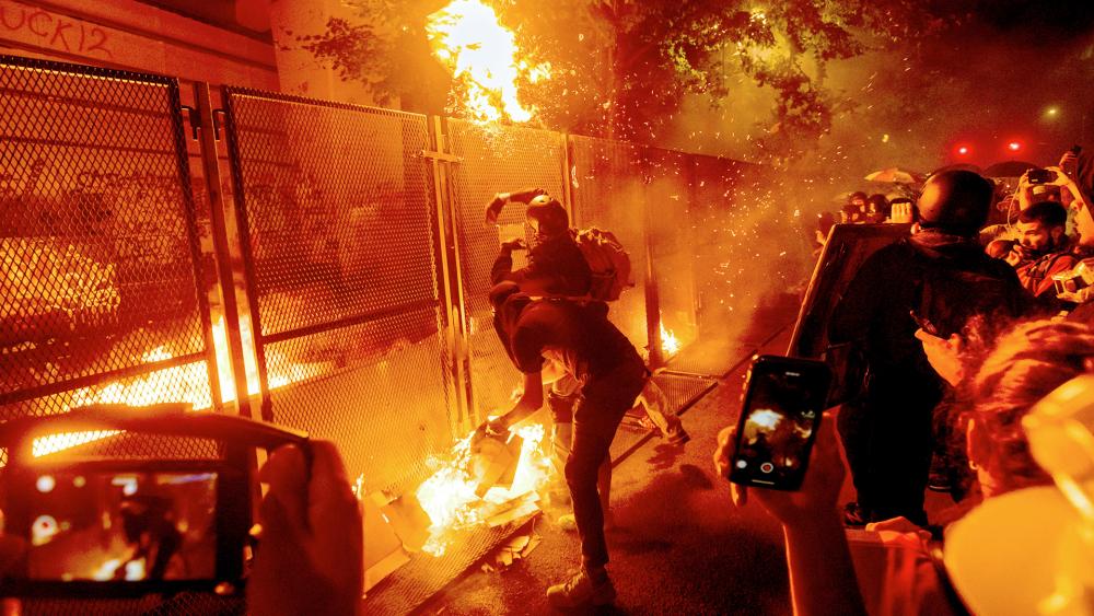 Activiștii radicali din Portland, Oregon, au ars Biblii și steagul american în fața tribunalului federal în acest weekend.