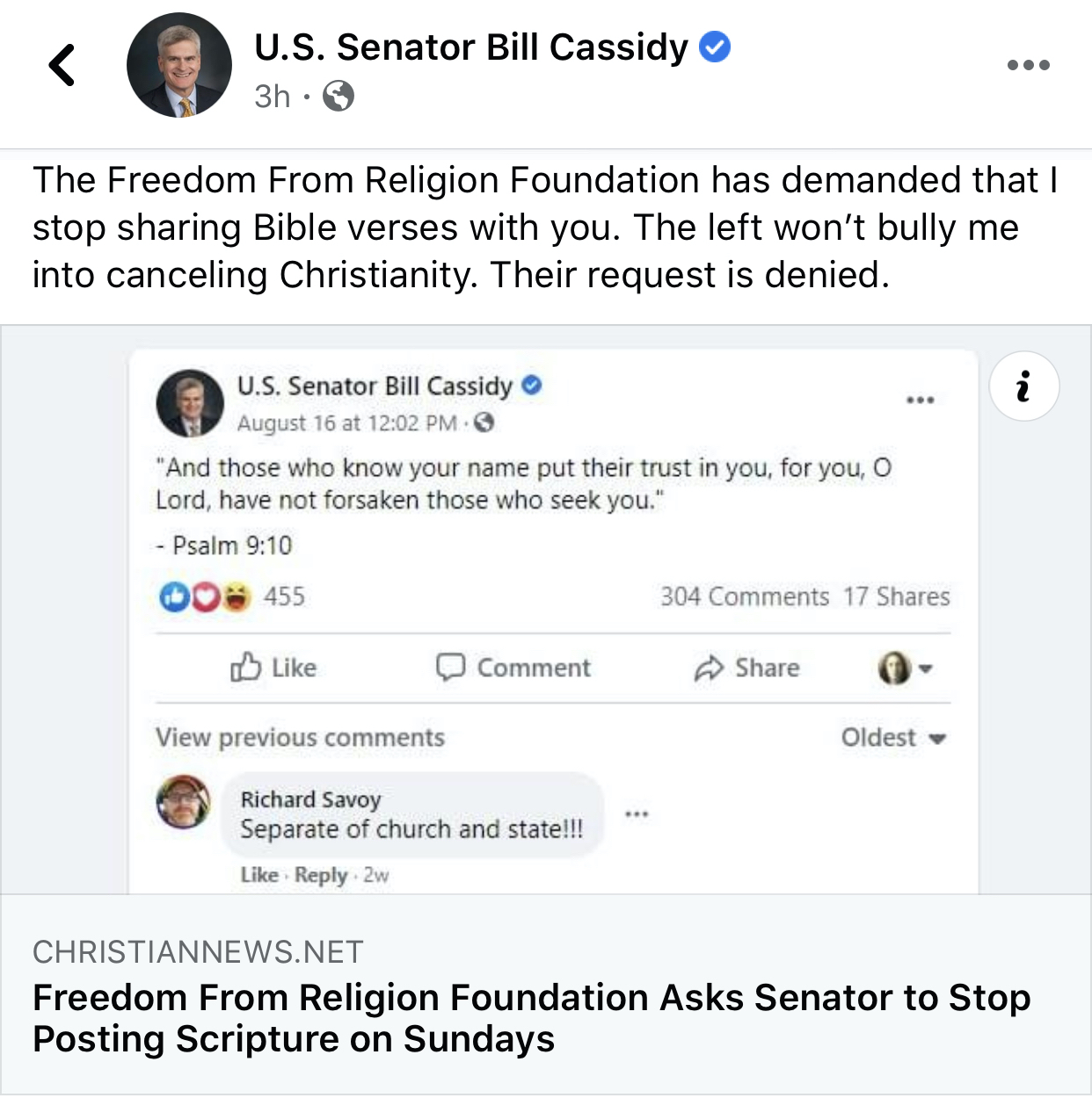 Un senator american din partea statului Louisiana a declarat că nu va înceta să posteze versete din Sfânta Scriptură, după ce o organizaţie denumită Freedom From Religion Foundation (FRFF) (Fundaţia pentru Libertate Fără Religie, n. trad.) i-a cerut să şteargă astfel de postări făcute pe contul lui oficial de senator şi de a se abţine de a face astfel de postări în viitor.