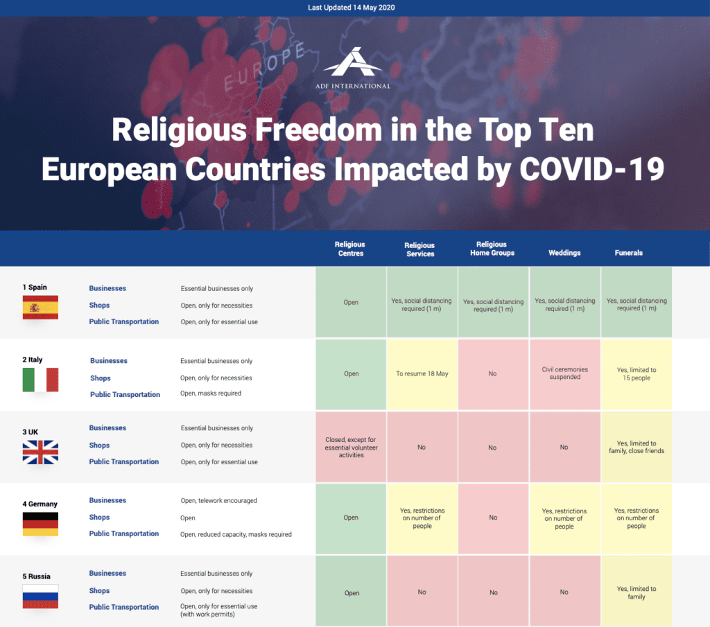 Odată cu începerea măsurilor de izolare, speranța că guvernele europene vor remedia rapid această situație a rămas în picioare. Cu toate acestea, redeschiderea serviciilor religioase a venit doar prin presiuni constituționale în cel puțin două dintre cele mai mari țări din Europa – Germania și Franța. Portugalia, Țările de Jos, Elveția și Irlanda nu au eliminat încă restricțiile privind serviciile religioase, dar au definit datele pentru acest lucru în următoarele săptămâni. Belgia și Marea Britanie încă nu au date definite pentru aceasta.