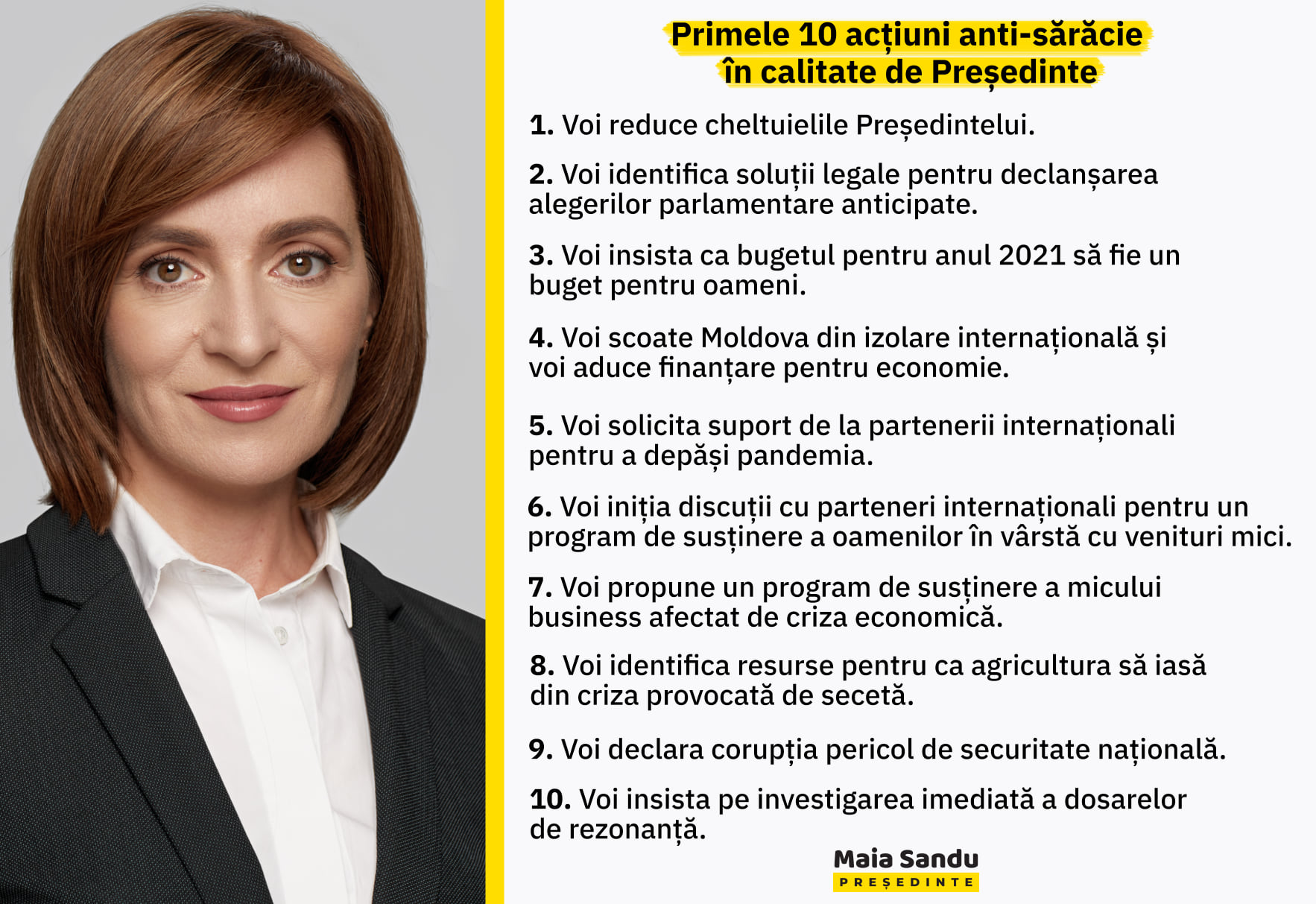„Dragi prieteni, oameni din satele și orașele Moldovei, oameni din diasporă, voi ați învins! Victoria este a dumneavoastră. Vă mulțumesc pentru mobilizarea uimitoare! Vă mulțumesc pentru încrederea enormă. Vă mulțumesc pentru unitatea pe care am reușit să o creăm împreună în această campanie. Vă promit să prețuiesc și să consolidez această unitate. Am spus de fiecare dată: Oamenii Moldovei sunt buni și corecți. Răbdarea lor a fost pusă la încercare de prea multe ori. Sunt mândră de moldoveni – când se unesc, ei pot face orice. Solidaritatea și unitatea moldovenilor au uimit ieri o lume întreagă. Vă mulțumesc pentru bucuria și mândria de a face parte din acest popor”.