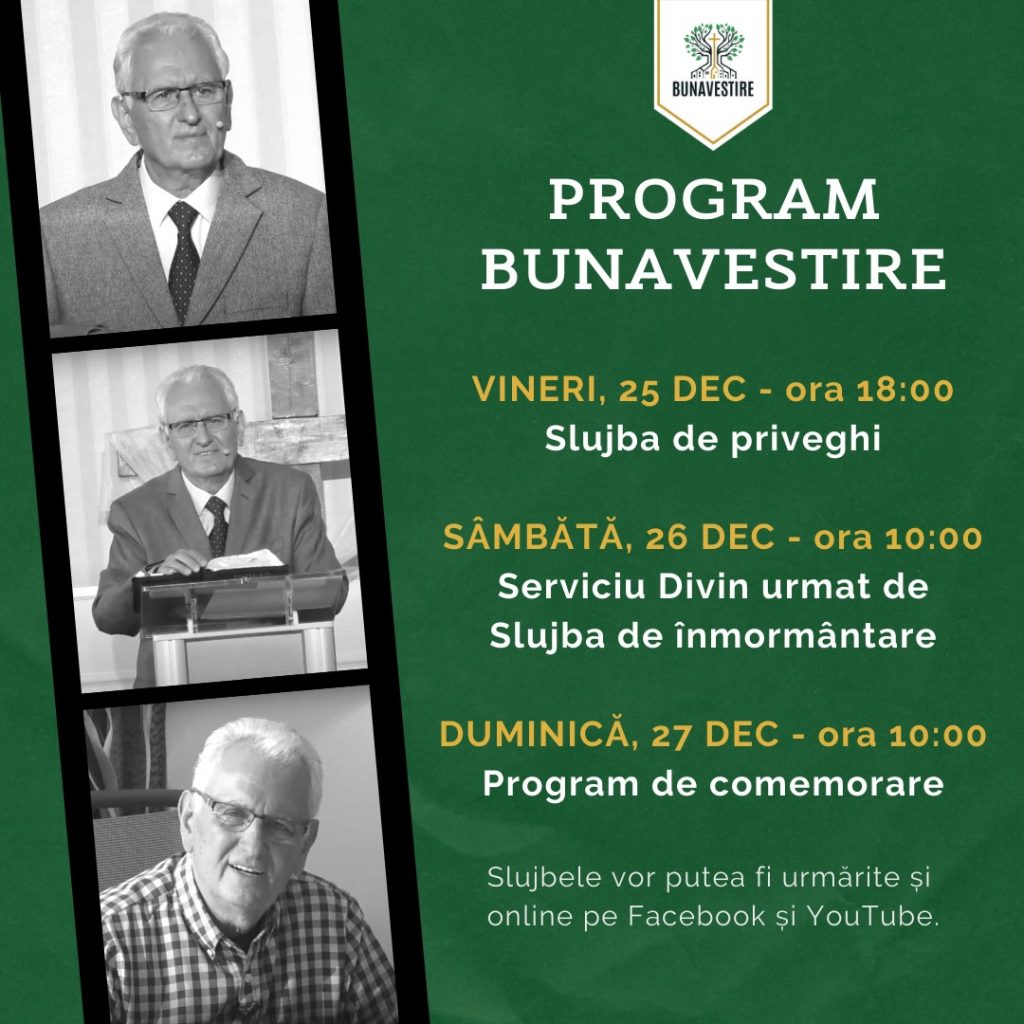 Duminică, 27 decembrie, de la ora 10:00, biserica va avea un program de comemorare a celui care i-a fost păstor și care a iubit-o până la capăt. Slujba va avea loc la Aurrum Palace.Cu părere de rău, vă anunțăm că trupul neînsuflețit al fratelui Taloș nu va fi prezent la niciuna dintre cele 3 slujbe. Vă rugăm ca la fiecare program să țineți cont de toate măsurile de siguranță împotriva covid. Toate slujbele, de priveghi, înmormântare și comemorare, vor putea fi urmărite și online atât pe pagina de Facebook a bisericii, cât și pe YouTube.