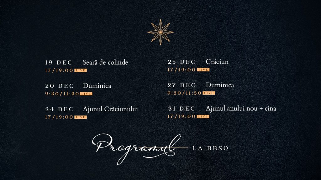 Dacă sunteți în Oradea sau într-o zonă fără acces la biserică, vedeți programul de Crăciun BBSO mai jos și accesați LIVE-ul pe canalul de Youtube sau Facebook BBSO.
