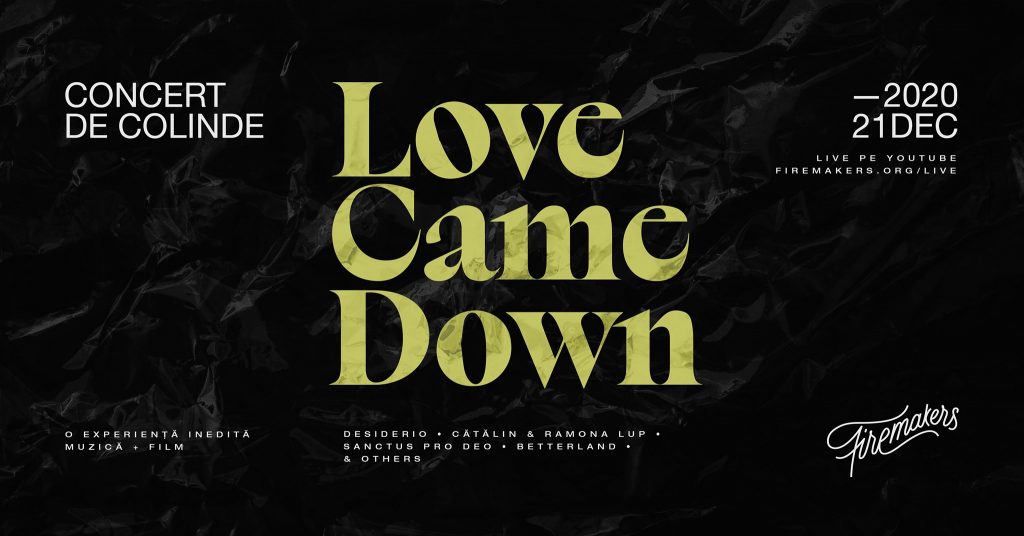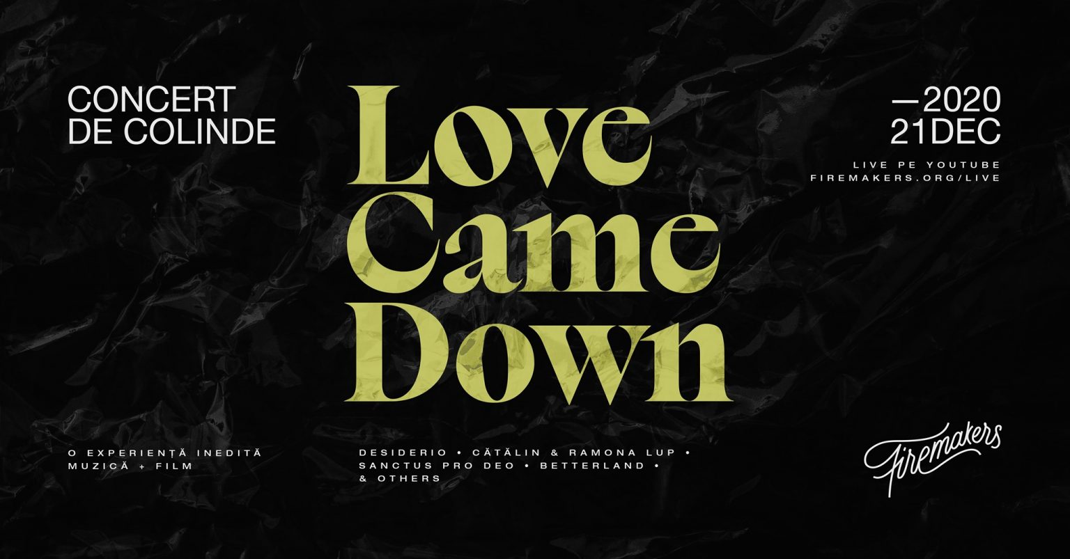 Concertul de colinde „Love Came Down” este o experiență inedită care combină armonios muzica și cinematografia. Alături de artiștii și grupurile muzicale: Desiderio Quintet, Cătălin și Ramona Lup, Sanctus Pro Deo, Betterland și alții, echipa Firemakers a îmbinat muzica, cinematografia, misiunea și caritatea, transformând aceste elemente într-un moment magic în prag de Crăciun.