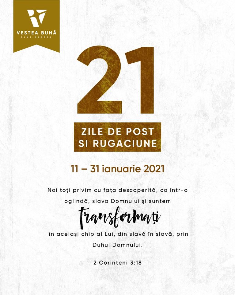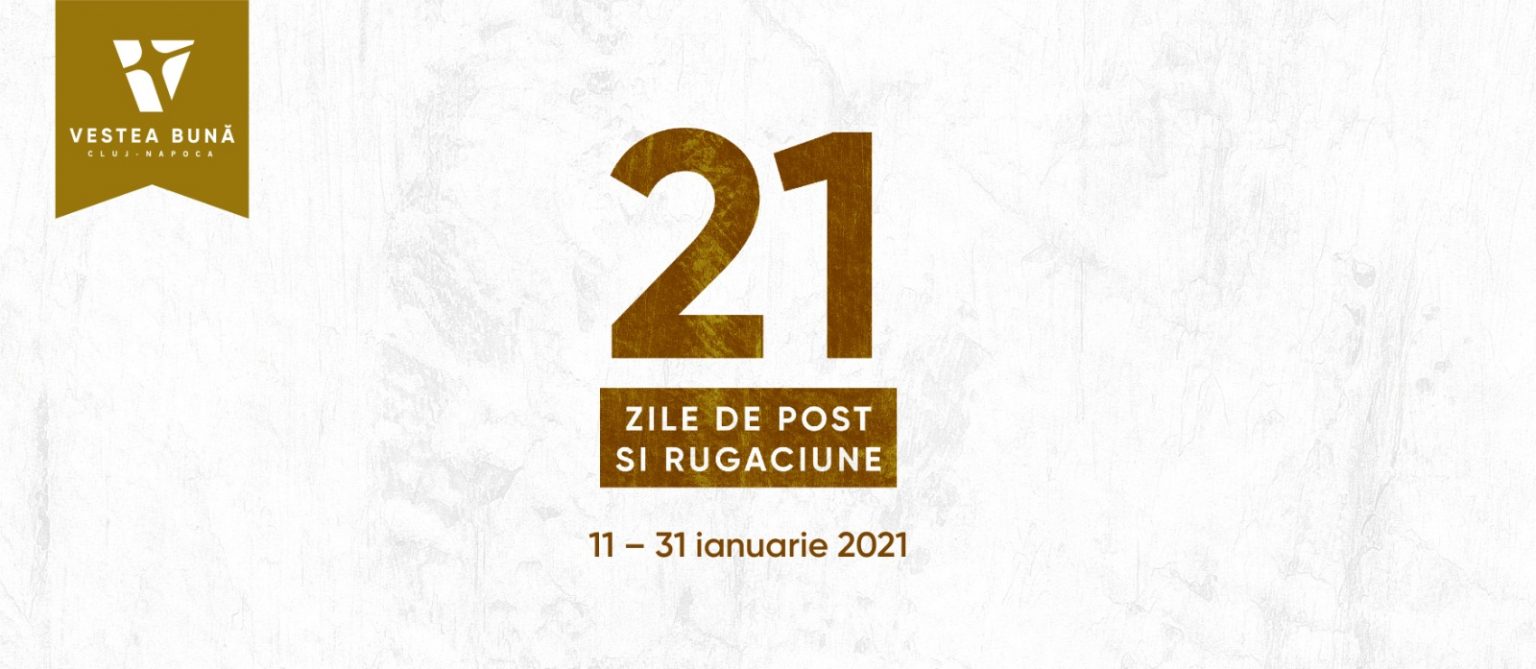În perioada, 11 – 31 ianuarie 2021, Biserica „Vestea Bună” din Cluj-Napoca lansează provocarea 21 de ZILE de POST și RUGĂCIUNE. Ce poate fi mai benefic pentru trup, minte și suflet decât o cură de detoxifiere fizică, emoțională, intelectuală și spirituală. Haideți să lăsăm 2020 în spate și să ne resetăm pentru un 2021 altfel. Cu acest mesaj din partea organizatorilor, vă chemăm să vă alăturați provocării lansate de Biserica „Vestea Bună” din Cluj.