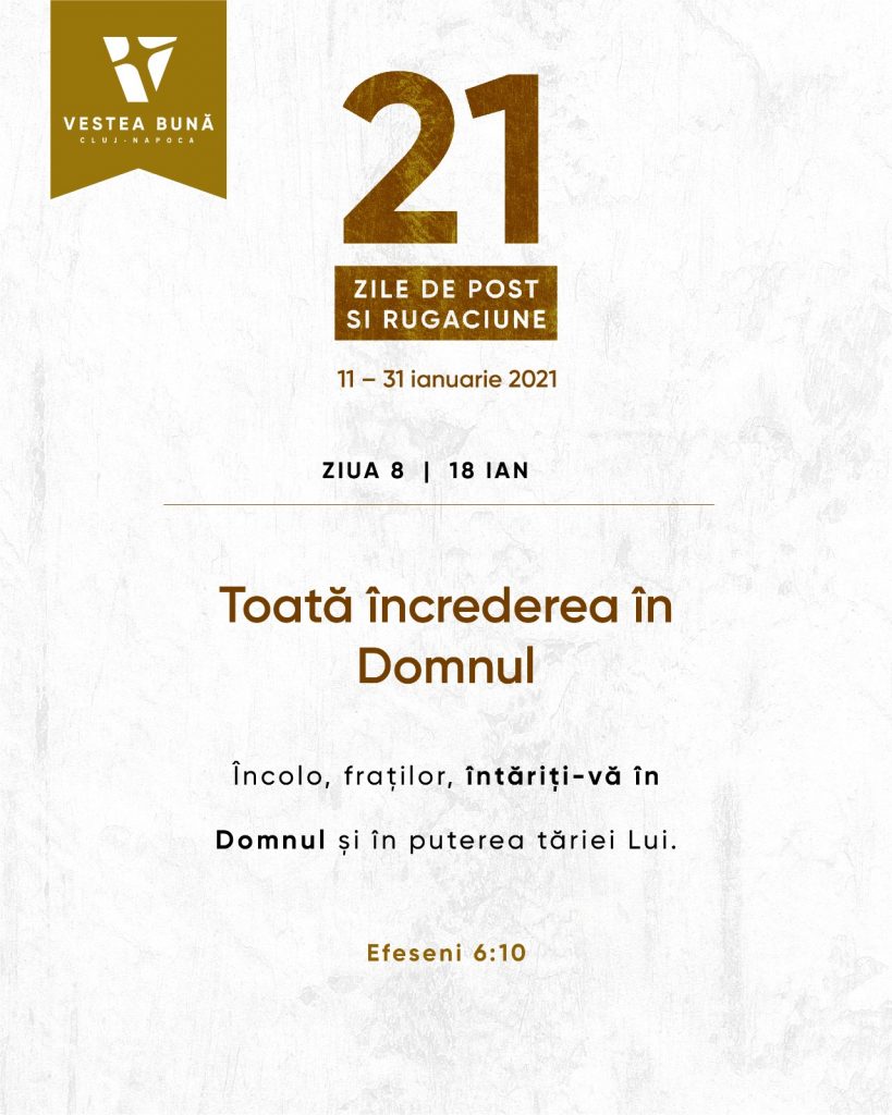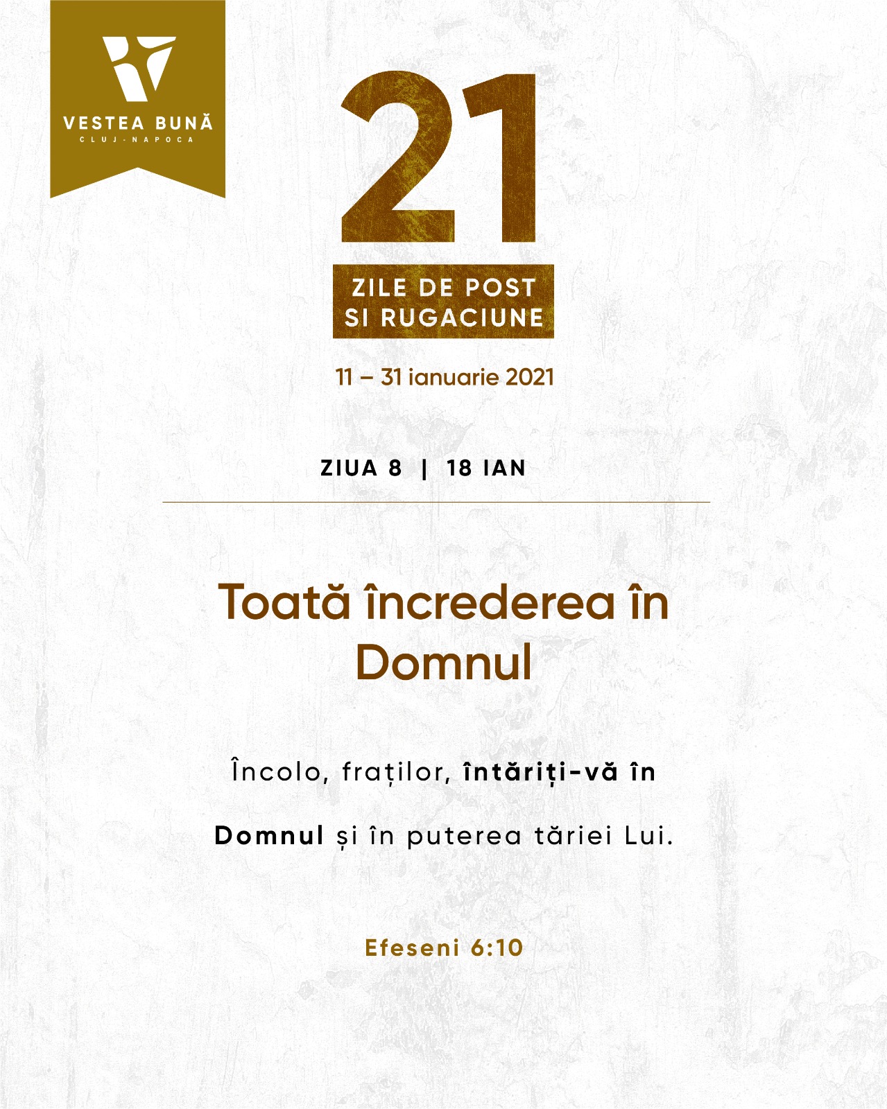 Dacă ați acceptat provocarea și mijlociți împreună cu Biserica „Vestea Bună” din Cluj-Napoca în provocarea „21 de zile de Post și Rugăciune” pentru anul 2021, profitați de oportunitate și alăturați-vă momentului unic de rugăciune de la ora 19:00. Găsiți locația Bisericii „Vestea Bună” din Cluj pe strada Rodnei 40, vedeți locația AICI!
