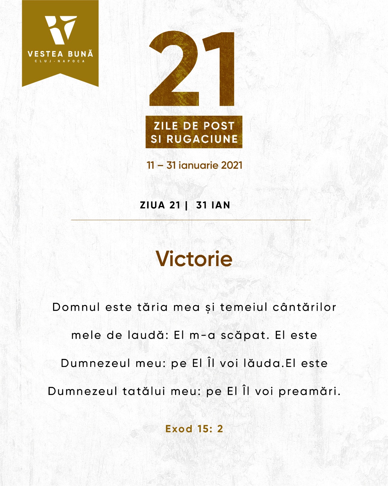 „Domnul este tăria mea și temeiul cântărilor mele de laudă: El m-a scăpat. El este Dumnezeul meu: pe El Îl voi lăuda. El este Dumnezeul tatălui meu: pe El Îl voi preamări.”