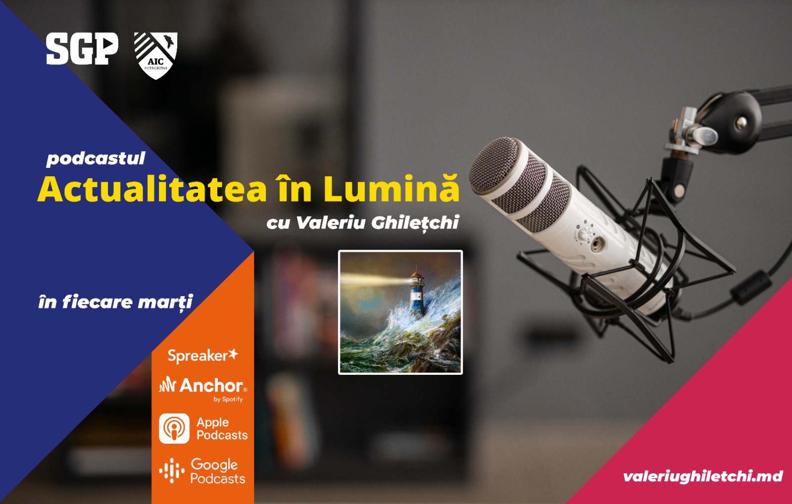 Podcastul „Actualitatea în Lumină” este o analiză a evenimentelor principale care au loc în țară ori peste hotare sau la opiniile care sunt exprimate în public de persoane influente prin prisma conceptului creștin despre lume și viață. Podcastul este realizat în cadrul unui parteneriat între Academia pentru Integritate în Conducere din Republica Moldova și fundația SGP din Olanda. Urmăriți în fiecare zi de marți „Actualitatea în Lumină” pe Spreaker, Anchor, Google Podcast și pe iTunes.