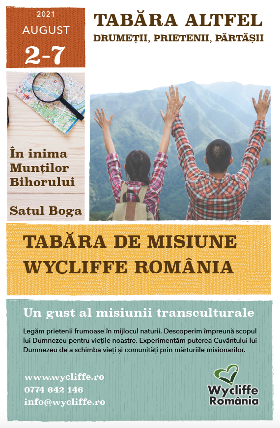 Săptămâna viitoare, în localitatea Boga, jud. Bihor, va avea loc tabăra Wycliffe România pentru mobilizare la misiune. Rugați-vă pentru pregătirile în desfășurare și ca Domnul să cheme tineri la misiune dintre cei care s-au înscris să participe. Rugați-vă pentru protecția Domnului în călătoriile spre tabără și la întoarcere.