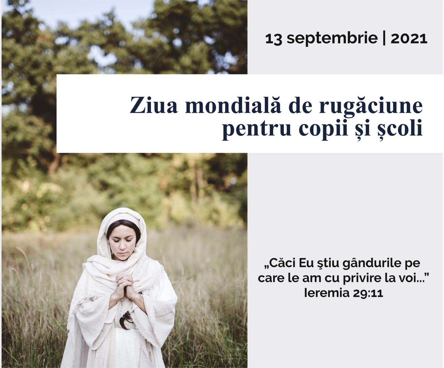 Dragi mămici și bunici, luni, 13 septembrie 2021, femeile din Comunitatea Creștină „Mame în Rugăciune” și Departamentului Femei al Uniunii Bisericilor Creștine Evanghelice Baptiste din Republica Moldova vă invită să vă alăturați Zilei Mondiale de Rugăciune pentru Copii și Școli.