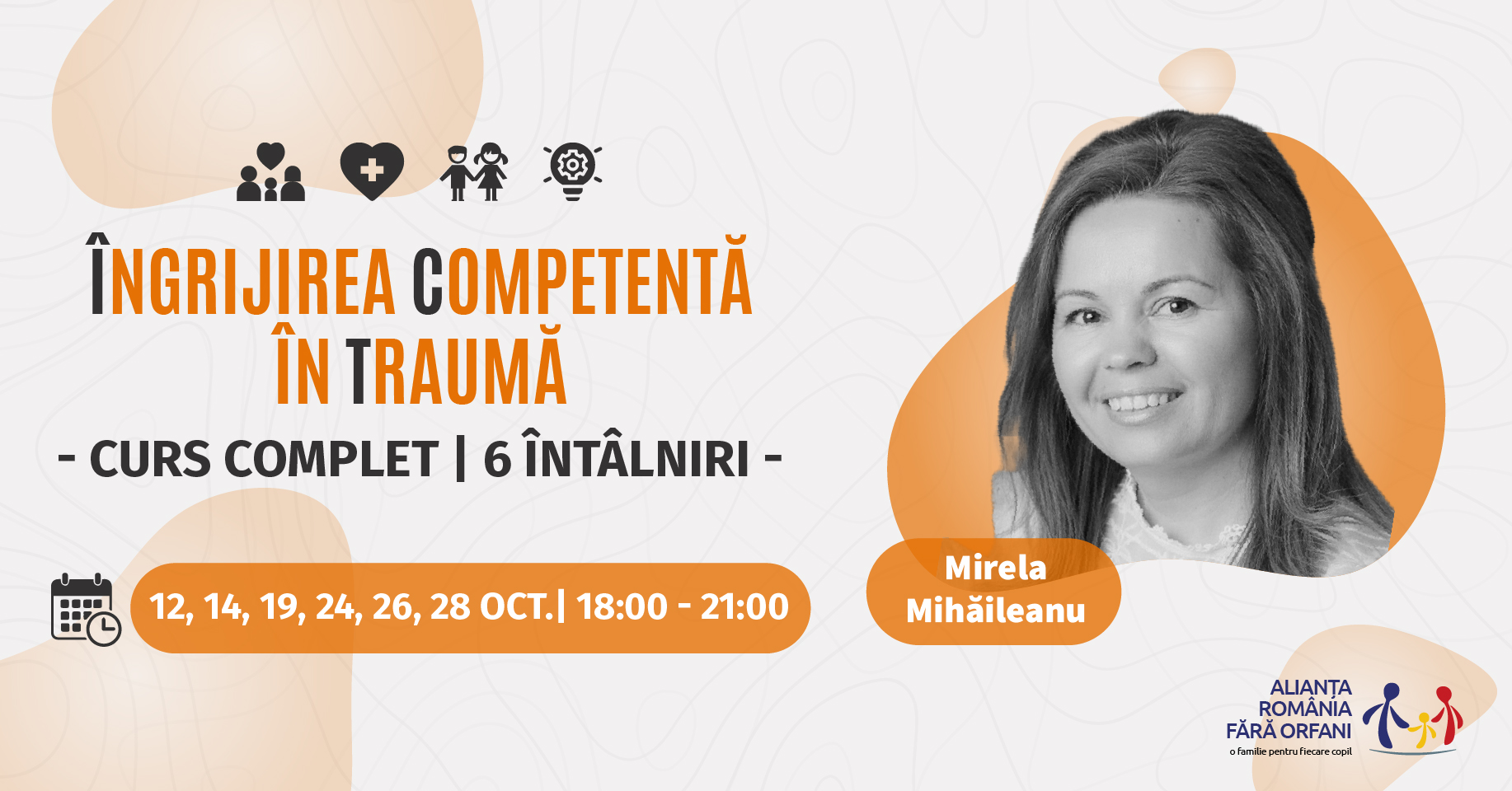 Alianța România Fără Orfani invită toți părinții adoptivi, de plasament sau cei interesați de adopție la training-ul: „Îngrijirea Competentă în Traumă”. Îngrijirea competentă a copiilor care au suferit traume este un curs intensiv care conține nouă module. Trainingul va avea loc ONLINE pe ZOOM, în perioada, 12-28 octombrie 2021, în 6 sesiuni de câte 3 ore.