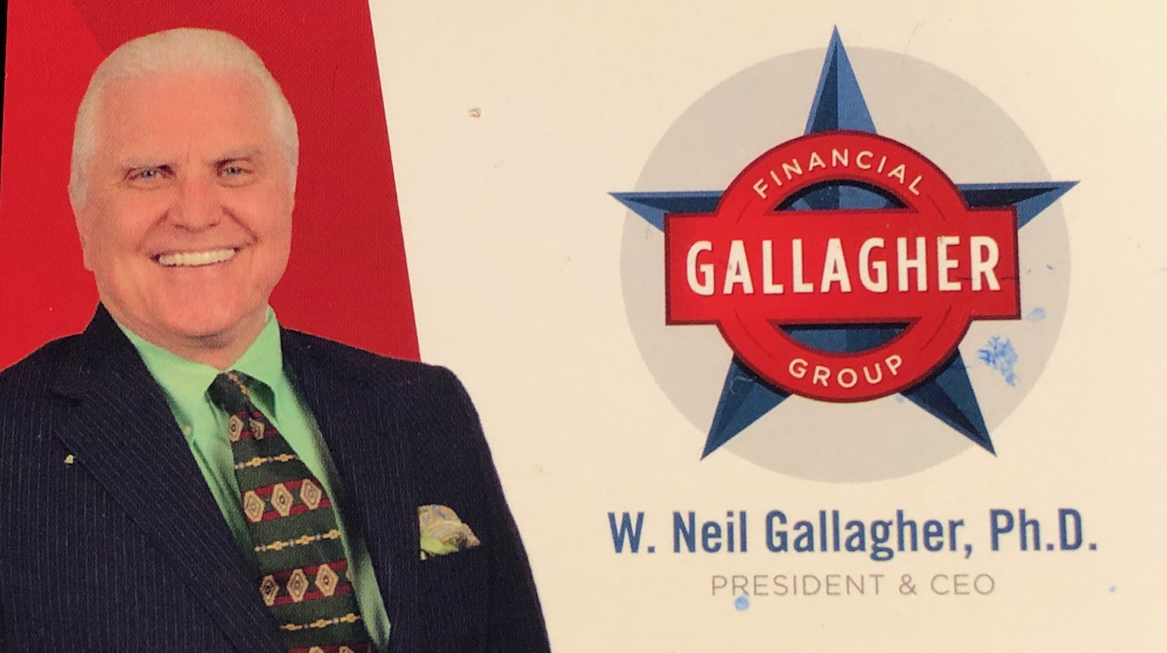 Gallagher, care a fost cândva președinte și CEO al Grupului Financiar Gallagher, s-a descris pe site-ul companiei ca fiind un consilier financiar cu experiență, jurnalist financiar și autor, care a servit și ca profesor la Texas Christian University.