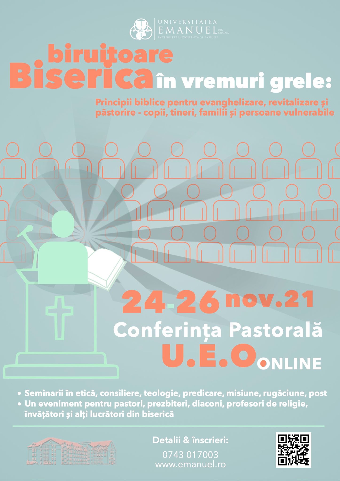 Evenimentul se adresează pastorilor, prezbiterilor, diaconilor, profesorilor de religie, învățătorilor și altor lucrări din biserică. Conferința Pastorală UEO este o tradiție care a început în 2014, cu o pauză în 2020. Fii parte din această ediție și descoperă puterea unei Biserici Biruitoare alături de slujitori din toată țara. Pentru a primi toate detaliile organizatorice și conexiunile pentru Conferința Pastorală UEO 2021, completați formularul de ÎNSCRIERE AICI!