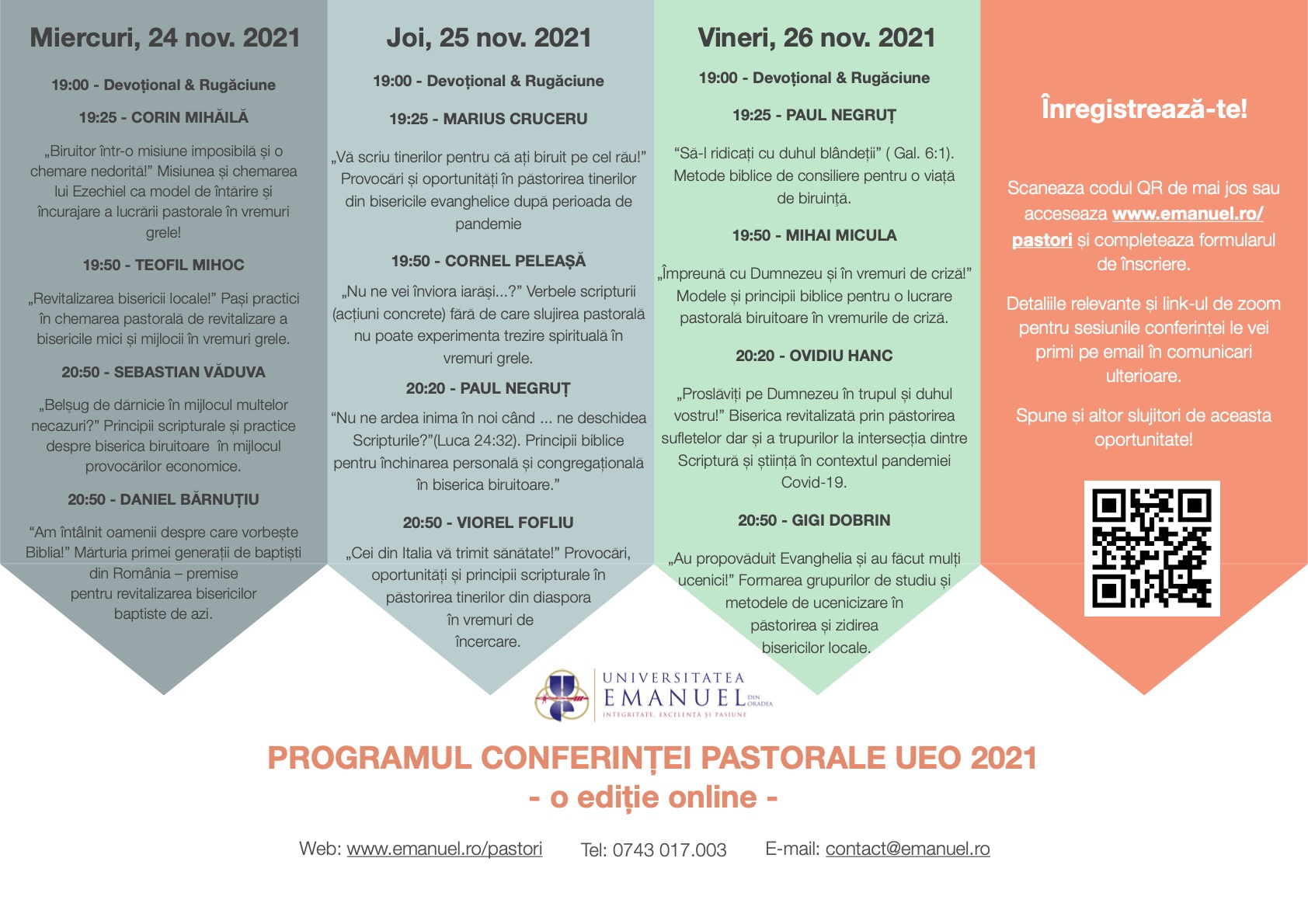 Tradiționala Conferință Pastorală organizată de Universitatea „Emanuel” din Oradea și-a deschis lista pentru înscrierea participanților. Ediția 2021 aduce în dezbatere tema: „Biserica biruitoare în vremuri grele” și se va desfășura în format online în perioada 24-26 noiembrie.