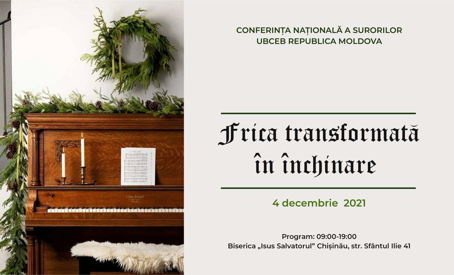 „Frica transformată în închinare” este tema ediției 2021 a Conferinței Naționale a Surorilor din cadrul Uniunii Bisericilor Creștine Evanghelice Baptiste (UBCEB) din Republica Moldova. Evenimentul va fi găzduit de Biserica Baptistă „Isus Salvatorul” din Chișinău, pe str. Sfântul Ilie 41.