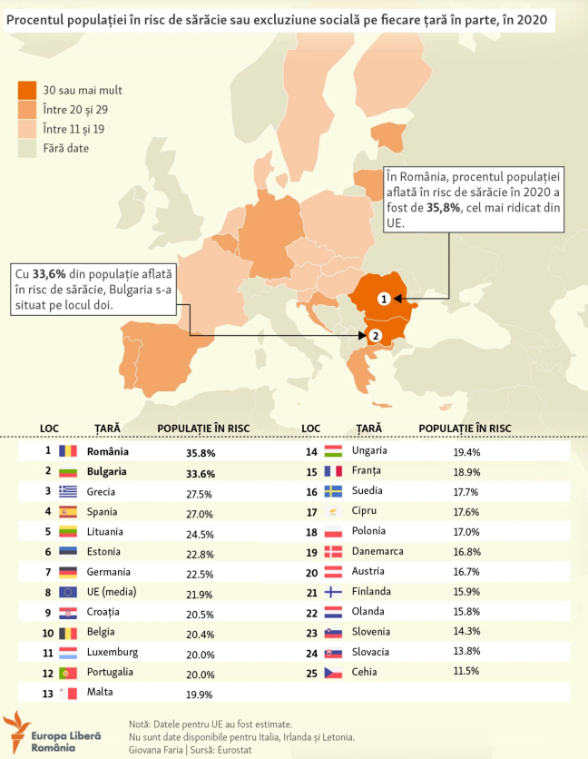 „Dintre țările membre ale UE, România a înregistrat cea mai mare rată a copiilor expuși riscului de sărăcie sau excluziune socială (41,5%), urmată de Bulgaria (36, 2%), Spania (31,8%) și Grecia (31,5%)”.