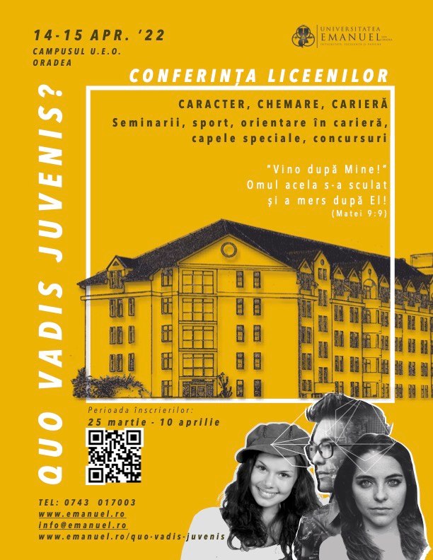 Share Facebook Twitter LinkedIn Pinterest Email Save the date! Evenimentul UEO dedicat liceenilor – Quo Vadis Juvenis – se reîntoarce! Înscrieri în perioada 25 martie – 10 aprilie. Pentru informații accesați www.emanuel.ro sau sunați la numărul de telefon 0743017003! Apreciază:Apreciază Încarc... Caracter Carieră chemare QVR Universitatea Emanuel Oradea