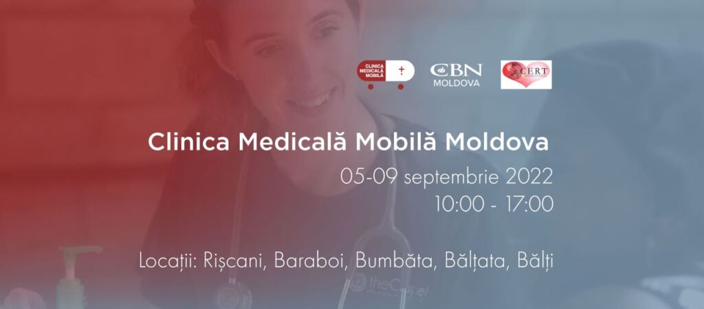 În perioada, 05-10 septembrie, echipa CBN Moldova, în parteneriat cu CERT Internațional desfășoară o nouă Clinica Medicală Mobilă. Doctori din SUA, Ucraina și Republica Moldova, vor presta servicii medicale gratuite, vor distribui medicamente și ochelari gratuit în mai multe localități pentru refugiați și localnici.