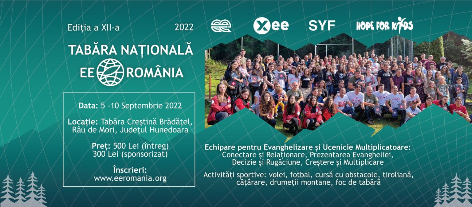 Participanți din 50 de biserici își dau întâlnire la Tabăra Națională EE România 2022. În perioada, 05-10 septembrie 2022, Tabăra Creștină Brădățel, Râu de Mori, Județul Hunedoara se transformă într-un centru de echipare pentru Evanghelizare.
