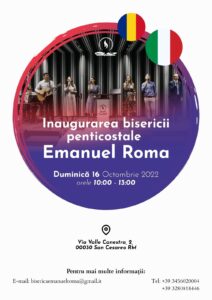 În data de 16 octombrie la Roma se deschid porțile unui nou locaș de cult! Biserica penticostală Emanuel ia naștere din inițiativa a șapte persoane care au decis să se unească în urma unei viziuni comune.
