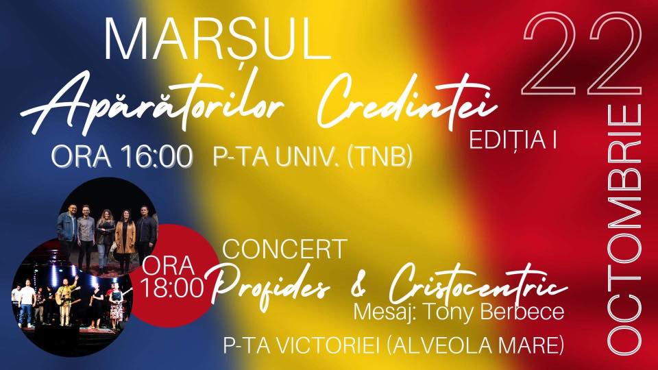 Evenimentul este un marș pașnic aprobat de Primăria Capitalei, care va avea loc sâmbătă, 22 octombrie, incepand cu ora 16:00, din Piața Universitatii – Teatrului Național pana în Piața Victoriei unde, în alveola centrală, este organizat un concert creștin si alocuțiuni cu tematică civică și creștină.