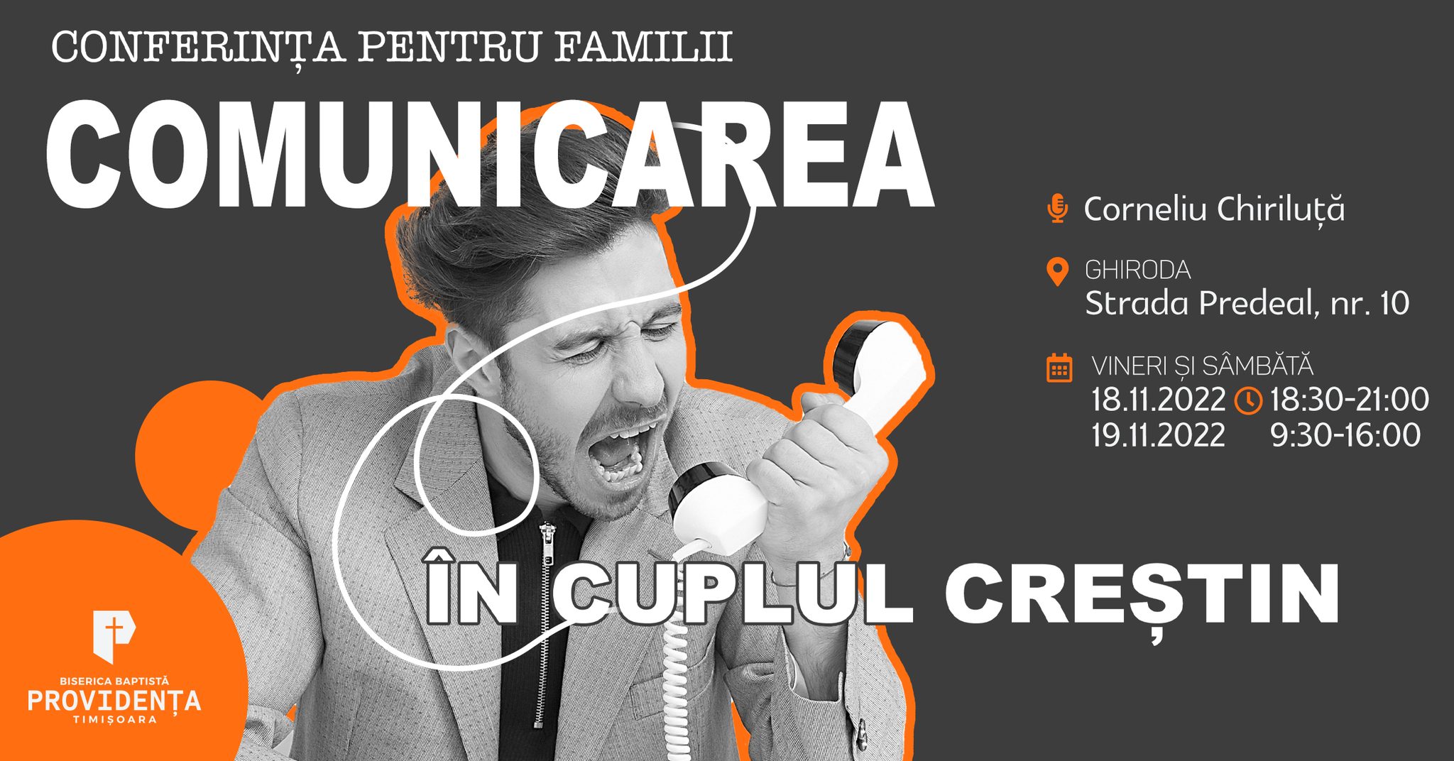 Corneliu Chiriluță, consilier, pastor și psihoterapeut creștin cu peste 20 de ani de experiență în arta consilierii este invitatul Conferinței pentru Familii la Biserica Baptistă „Providența” Timișoara. Tema evenimentului din 18-19 noiembrie 2022 este: „Comunicarea în cuplul creștin”.