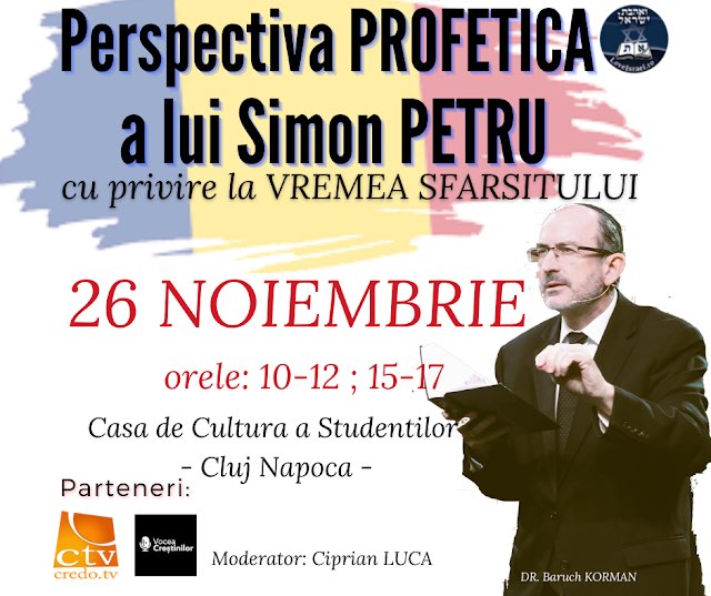 Vă invităm cu drag să participați la Conferința: „Perspectiva Profetică a lui Simon PETRU cu privire la Vremea Sfârșitului”. Sâmbătă, 26 noiembrie la Casa de Cultură a Studenților din Cluj Napoca, între orele 10-12 și 15-17.