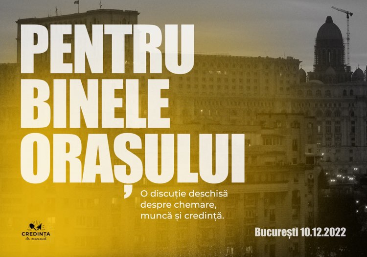 Pornind de la această premiză, echipa Credința la Muncă ne invită la o discuție deschisă cu genericul „Pentru binele orașului”. La masa de discuții vin profesioniști locali din cele mai diverse domenii unde vom discuta despre cum munca pe care o facem are impact dincolo de pereții companiilor pentru care lucrăm.