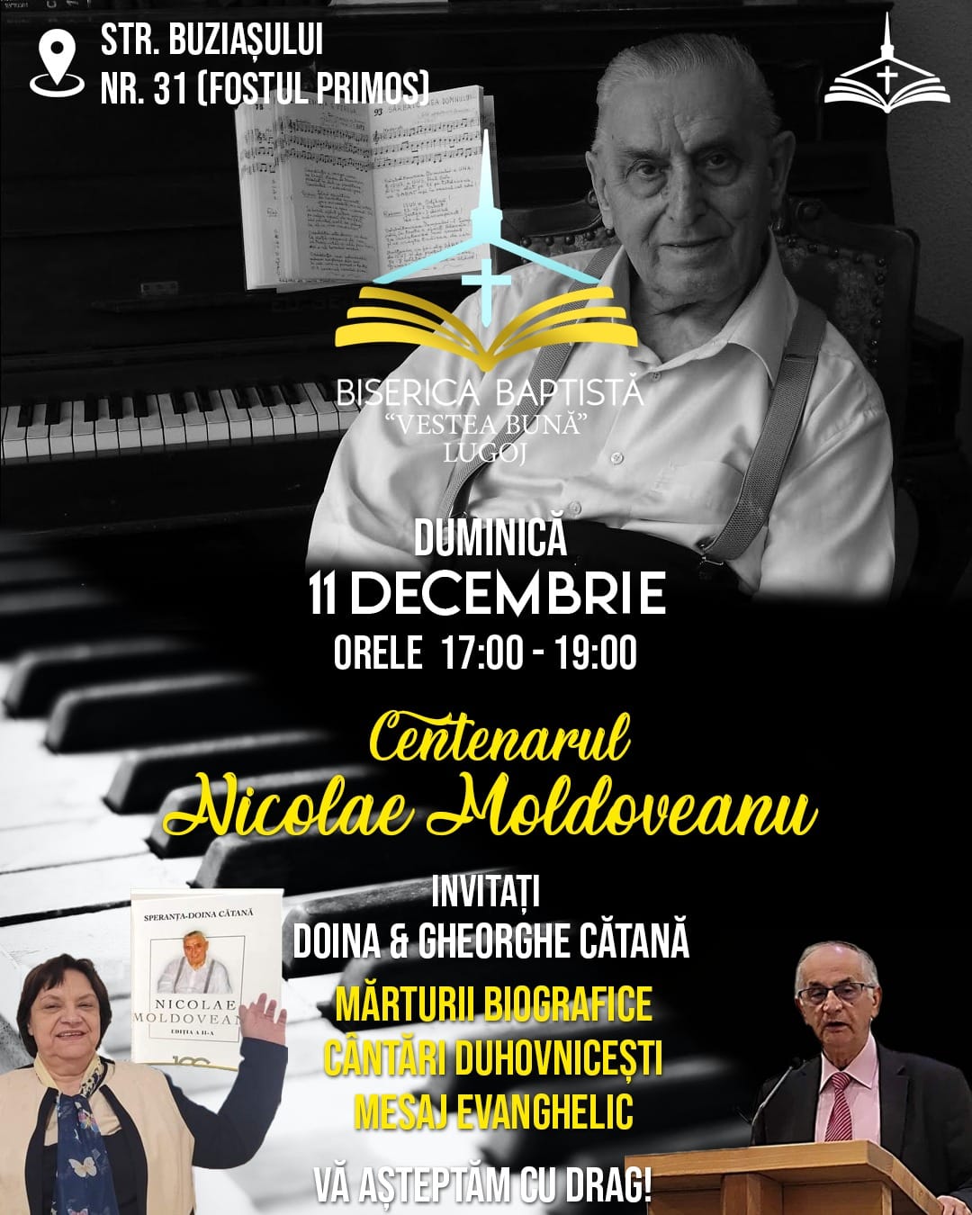Cu acest prilej unic, Biserica „Vestea Bună” din Lugoj invită toți moștenitorii acestui har să sărbătorească centenarul lui Nicolae Moldoveanu. Duminică, 11 decembrie, ora 17:00, pe strada Buziașului nr. 31 din Lugoj, ne aducem aminte de viața și lucrarea lui. Alături de organizatori vin și familia Catană, cei care au făcut drumuri nenumărate la Sibiu pentru a scrie biografia acestui titan al credinței.