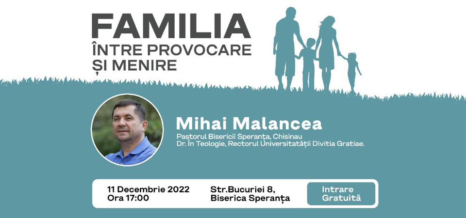 „Familia între provocare și menire” este un subiect actual pentru vremurile care le trăim. Duminică, 11 decembrie, ora 16:30 Biserica „Speranța” din Chișinău este gazda unei seri specială dedicată familiilor de toate vârstele.