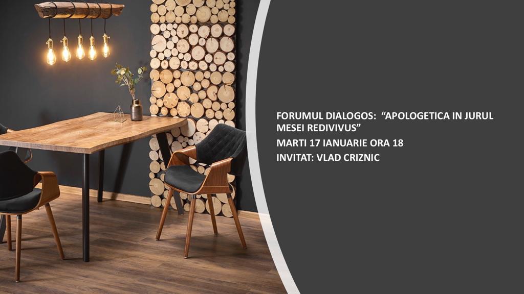 Maeștri, de această dată, vor fi teologul Emil Bartoș (amfitrion al Forumului Dialogos) și Vlad Crîznic. Vlad Crîznic este arădean, fost elev al Colegiului Moise Nicoară și absolvent Liceul Baptist Alexa Popovici, studii superioare la King’s College, Marea Britanie, doctorand, încă, în cadrul unui celebru institut localizat în Oxford. De mulți ani, Vlad Crîznic este Director European al unui reputat Institut de Apologetică.