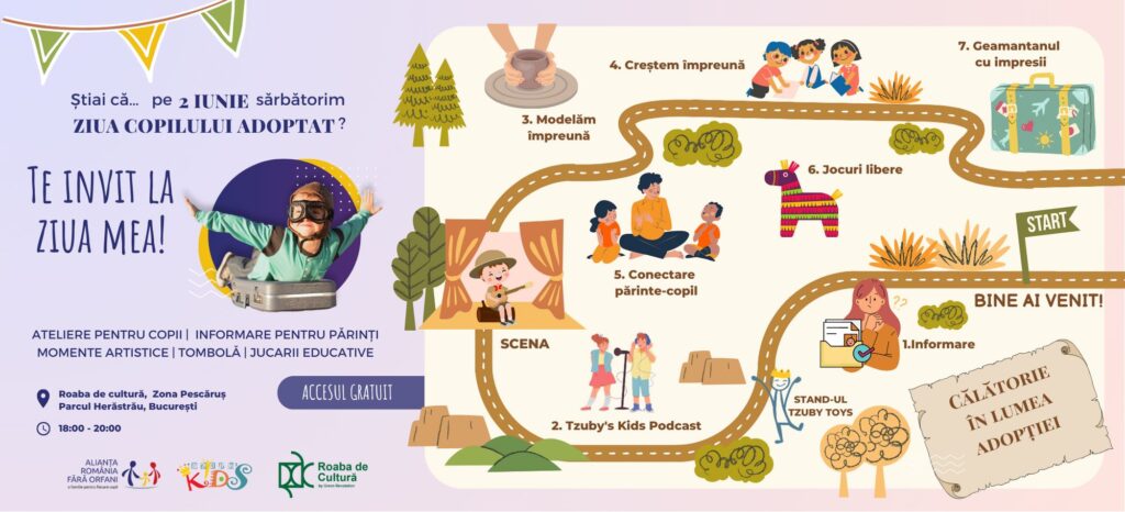 Alianța România Fără Orfani (ARFO) și Asociația Tzuby’s Kids în parteneriat cu Roaba de Cultură sărbătoresc Ziua Națională a Copilului Adoptat în 2 iunie, în Parcul Herăstrău– zona Pescăruș din București, începând cu ora 18:00.