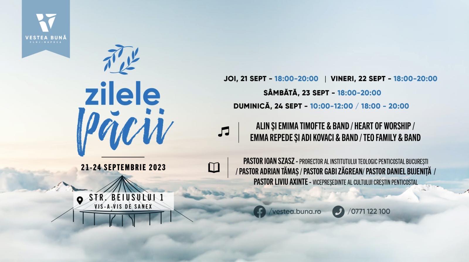 Cu ocazia Zilei Mondială a Păcii, marcată anual la 21 septembrie, Biserica „Vestea Bună” din Cluj Napoca invită la un eveniment unic: „Zilele Păcii” 2023. În perioada, 21-24 septembrie, sunteți invitați să ne rugăm pentru pace și să proclamăm pacea.